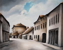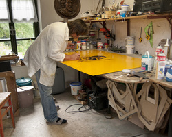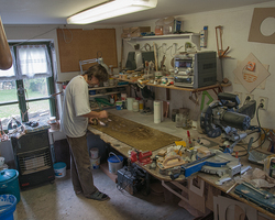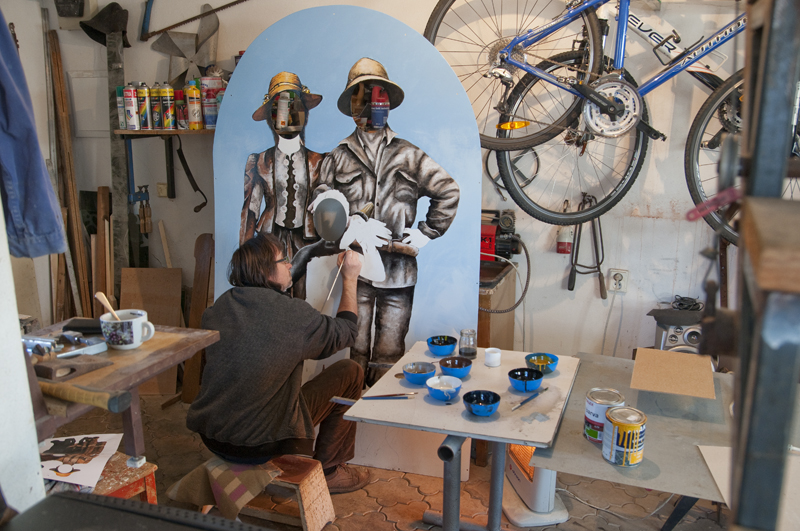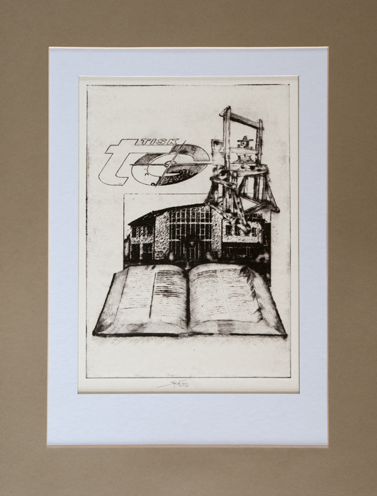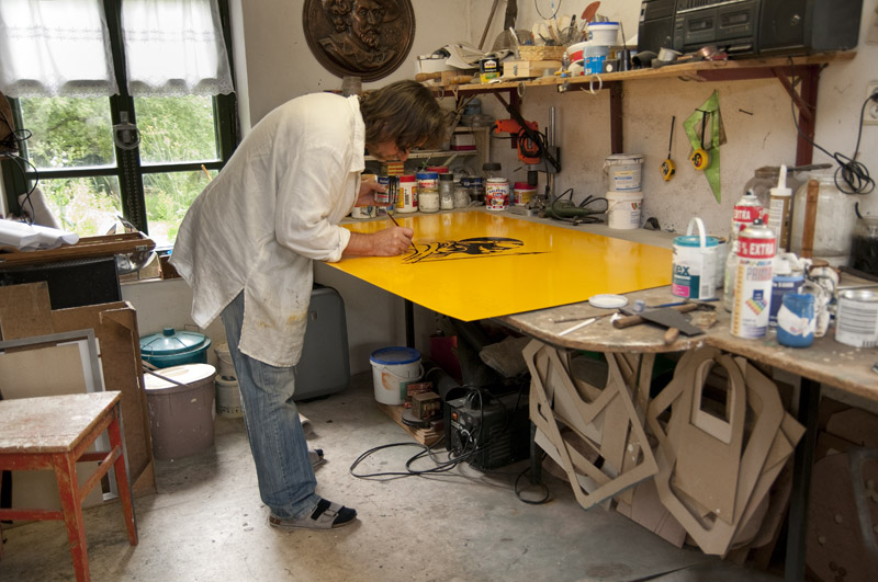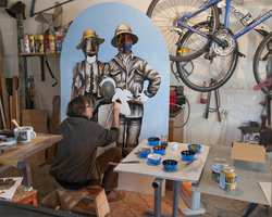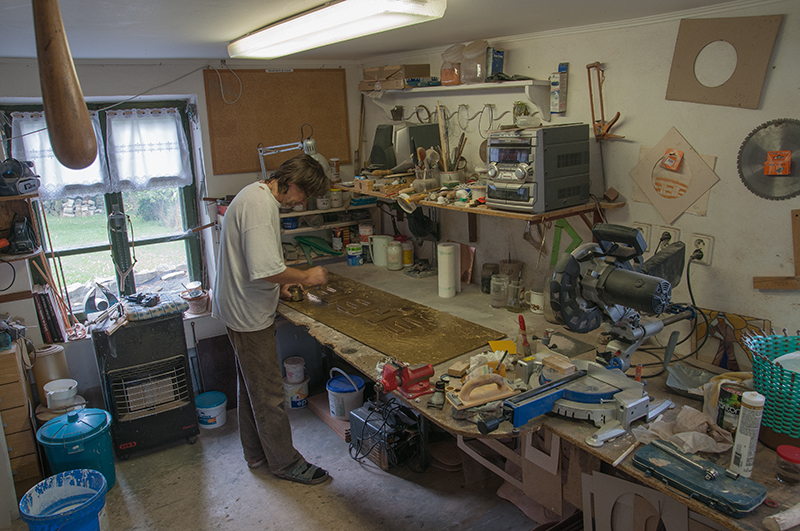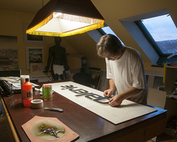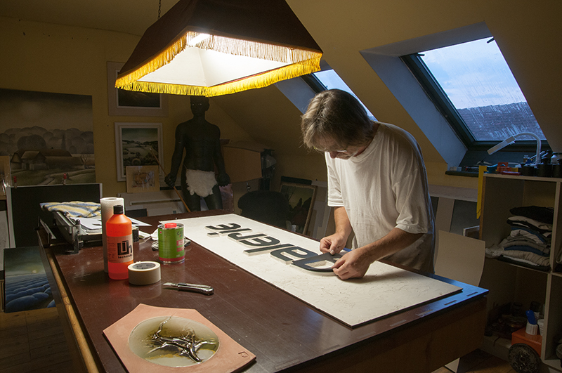 Práce na plechovém poutači pro Africké muzeum Dr. Emila Holuba
